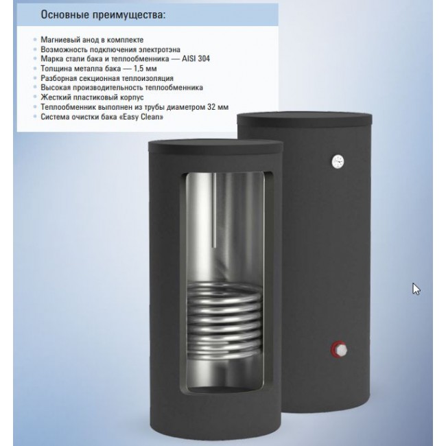 - Бойлер допускает установку электрического ТЭНа, который может использоваться как резервный источник подогрева в межсезонье или при временной остановке котла. Разборная теплоизоляция не только снижает потери тепла, но и обеспечивает удобный доступ к узлам при техническом обслуживании.