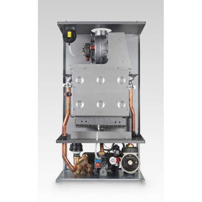 Модель оснащена высокоэффективным медным теплообменником отопительного контура, что обеспечивает превосходную передачу тепла и длительный срок службы агрегата. Для приготовления горячей воды используется отдельный пластинчатый теплообменник из нержавеющей стали, устойчивый к коррозии и гарантирующий стабильный напор.