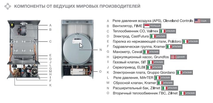 ВЫСОКАЯ ЭФФЕКТИВНОСТЬ И ШИРОКИЙ ДИАПАЗОН МОДУЛЯЦИИ МОЩНОСТИ - высокий КПД 91,2%; низкий уровень вредных выбросов обеспечивается идеальным сочетанием горелки из нержавеющей стали Polidoro, первичного медного теплообменника Valmex с защитным покрытием и газового клапана SIT.
