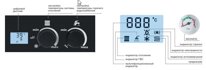 - цифровая панель осуществляет интуитивно понятную индикацию работы котла и позволяет настраивать работу системы отопления и горячего водоснабжения.