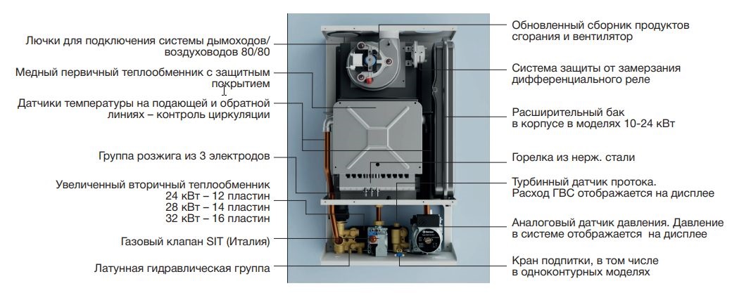 - увеличенный теплообменник ГВС обеспечивает надежность и комфорт приготовления горячей воды.