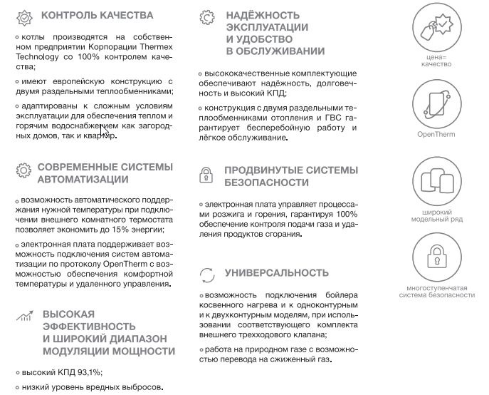 Надежность. Котел имеет все современные системы безопасности, а качественные комплектующие подтверждают высокий ресурс бесперебойной работы, заложенный в устройстве. Уверенный в качестве своего продукта производитель дает полную гарантию в 2 года на газовый котел.