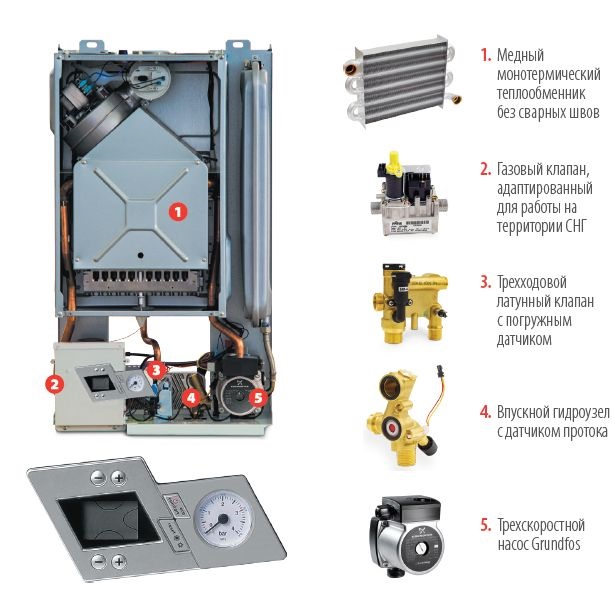 - Тип: двухконтурный, с вторичным проточным теплообменником ГВС из нержавеющей стали