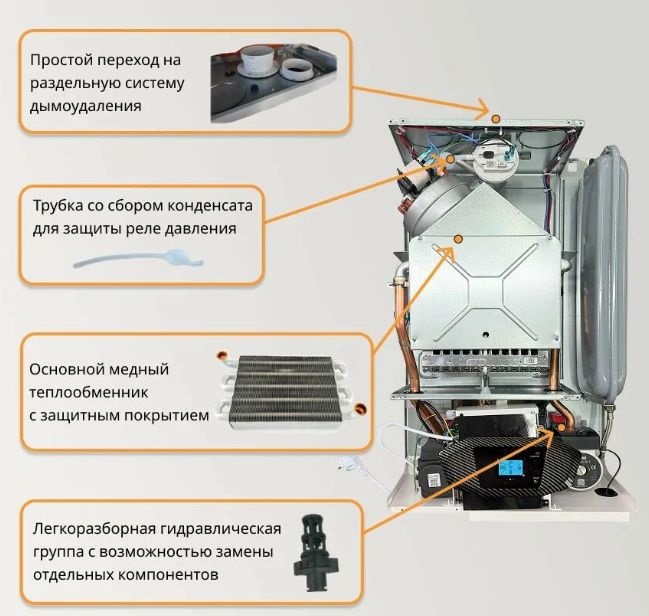 - Интеллектуальное управление — удобный дисплей с подсветкой и поддержка комнатных датчиков, включая OpenTherm-протокол (с 2021 года).