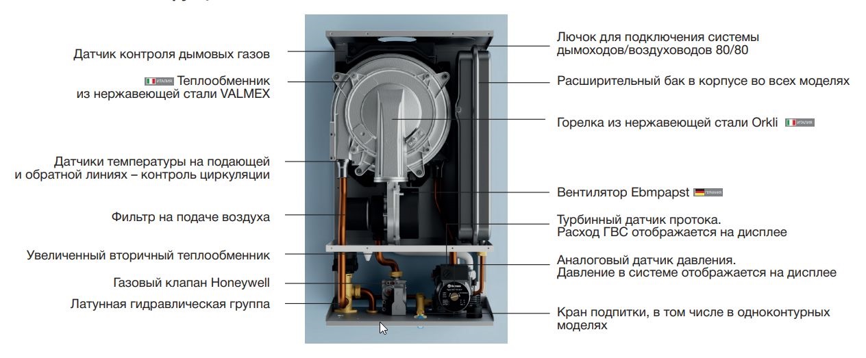 - теплообменник из нержавеющей стали Valmex, горелка Orkli; Вентилятор EBM Papst, газовый клапан SIT;
