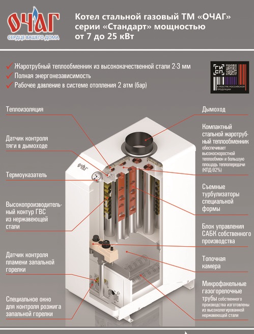 Эффективность достигается за счёт усовершенствованного жаротрубного теплообменника, выполненного из котельной стали, соответствующей ГОСТ.
