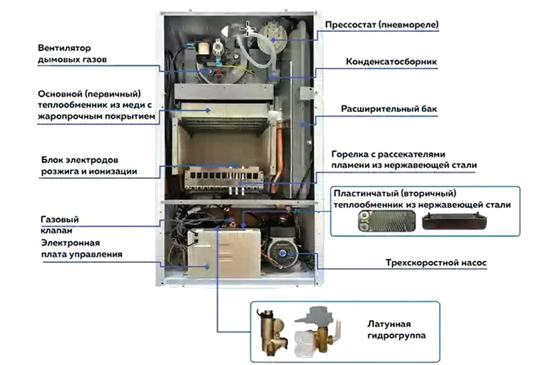 - Вторичный (ГВС) теплообменник: из нержавеющей стали