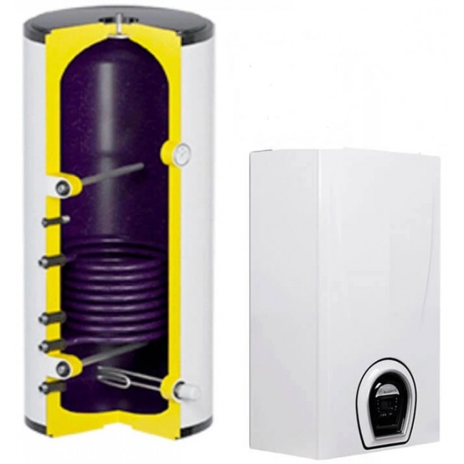 Комплект включает высокотехнологичный настенный котёл Federica Bugatti 24B VARME и бойлер косвенного нагрева S-Tank PWL 150 объёмом 157 литров. Вместе они образуют сбалансированную систему, способную эффективно обогреть дом площадью до 240–250 м² и обеспечить большой объём горячей воды для всей семьи.