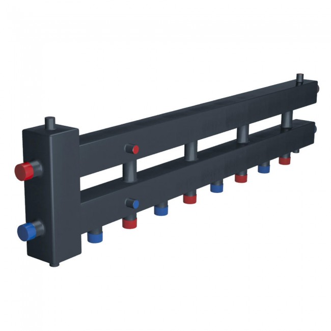 Коллектор с гидрострелкой на 5 контуров ГРУ+КМГ60-5ВН от Российского производителя RISPA — является гидравлическим разделительным узлом, который совмещен в единую конструкцию с коллектором модульного типа. Общая схема — горизонтальная, гидрострелка может обслуживать котел мощностью до 60 кВт. Потребители подключаются снизу и сбоку (4+1).