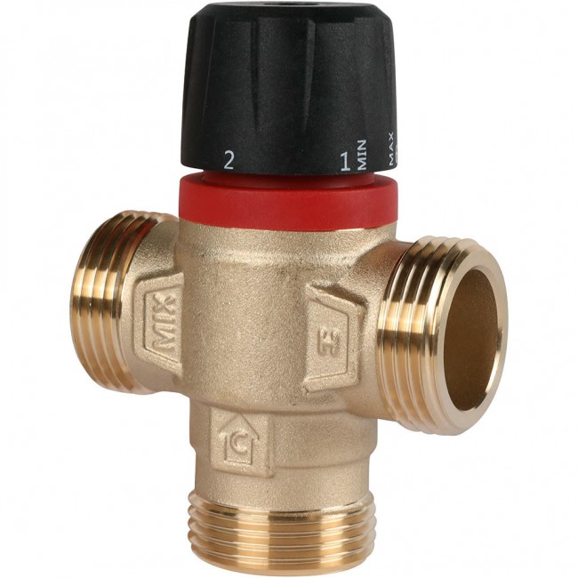 Термостатический смесительный клапан имеет два входных штуцера для подвода смешиваемых сред и один выходной. В клапан встроен перенастраиваемый термостатический элемент, поддерживающий в зависимости от модификации клапана температуру теплоносителя в диапазонах 20 – 43°С