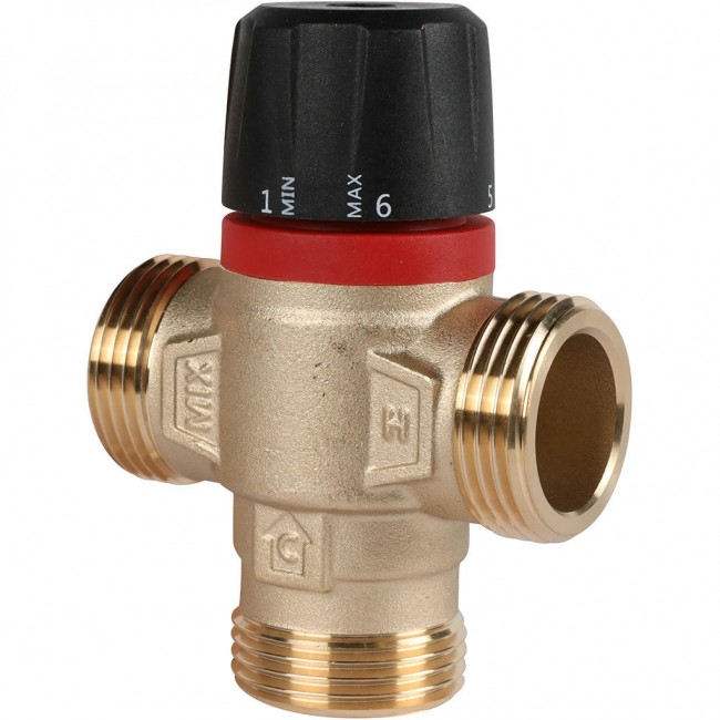 Термостатический смесительный клапан имеет два входных штуцера для подвода смешиваемых сред и один выходной. В клапан встроен перенастраиваемый термостатический элемент, поддерживающий в зависимости от модификации клапана температуру теплоносителя в диапазонах 30 – 65°С.