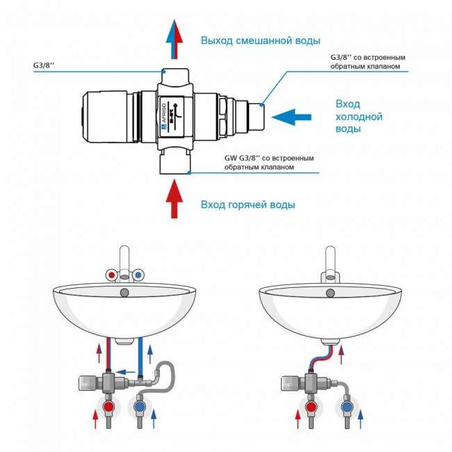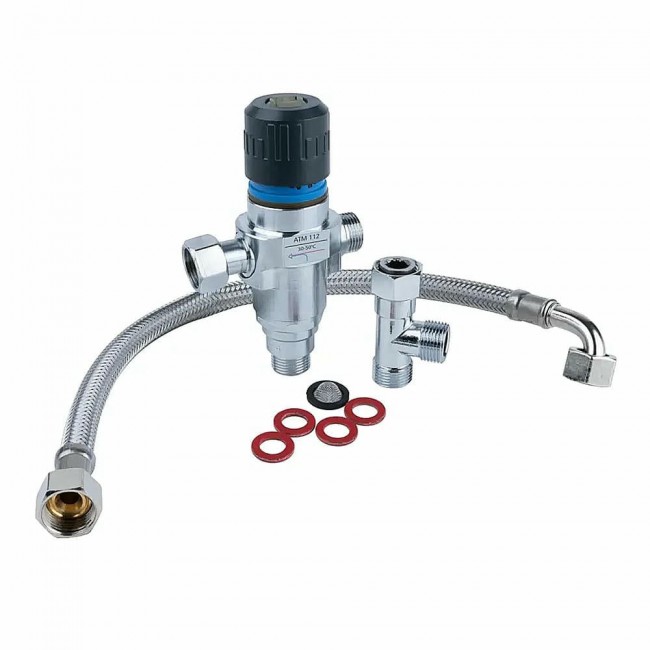 Клапан ATM 112 предназначен для смешивания двух потоков воды с разными температурами и поддержания заданной температуры. Устанавливается под раковиной. Может использоваться как для смесителя с регулировкой температуры, так и со смесителем без возможности регулирования. В комплект поставки входит соединительный шланг, тройник, сетка, набор фитингов.