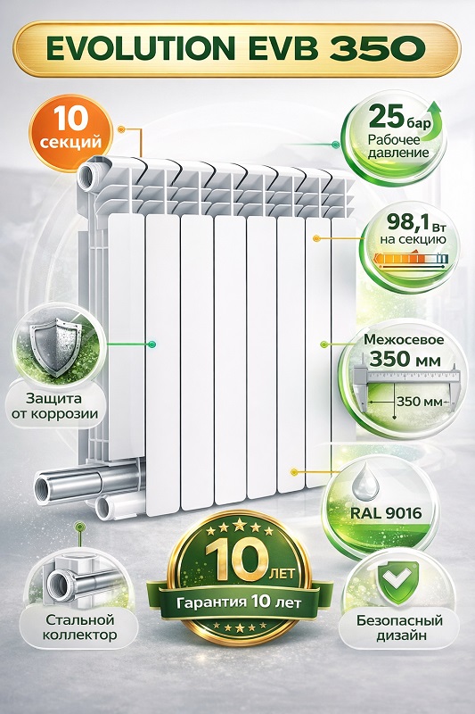 Биметаллический радиатор EVOLUTION EVB 350 - это оптимальный выбор для тех, кто ценит надежность, эффективность и современный внешний вид отопительного оборудования.