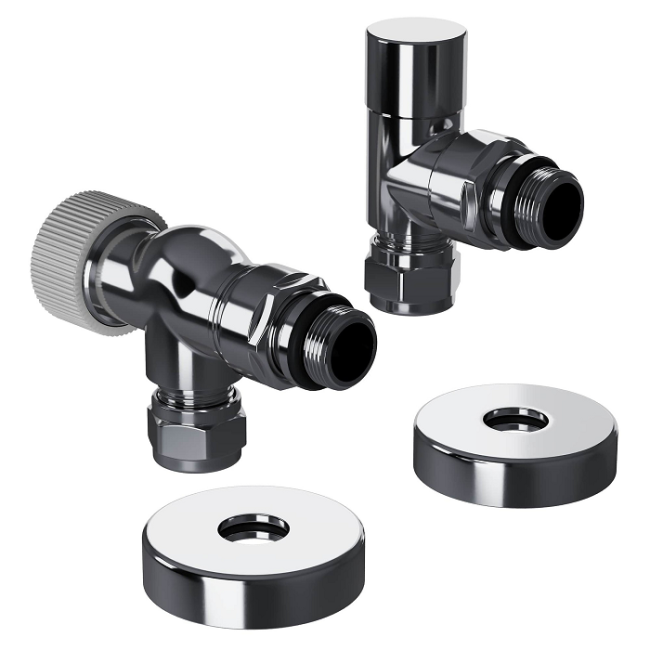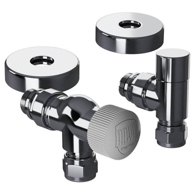 Термостатические наборы серии Design Pro поставляется в необходимой для чистового монтажа комплектации: клапан термостатический для установки на подающий трубопровод, запорный клапан для установки на обратный трубопровод, 2 гайки-фитинга для подключения клапанов к монтажной трубке 15 мм и 2 цельных латунных отражателя с внутренним резиновым уплотнением внутренним диаметром 15,2 мм.