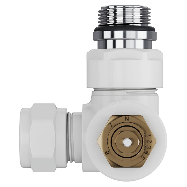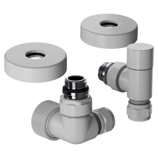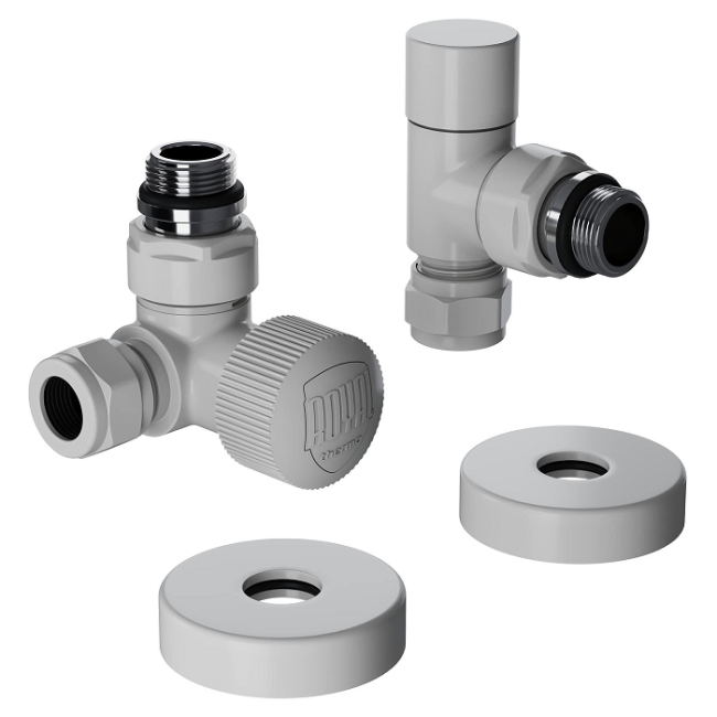 Термостатические наборы серии Design Pro поставляется в необходимой для чистового монтажа комплектации: клапан термостатический для установки на подающий трубопровод, запорный клапан для установки на обратный трубопровод, 2 гайки-фитинга для подключения клапанов к монтажной трубке 15 мм и 2 цельных латунных отражателя с внутренним резиновым уплотнением внутренним диаметром 15,2 мм.