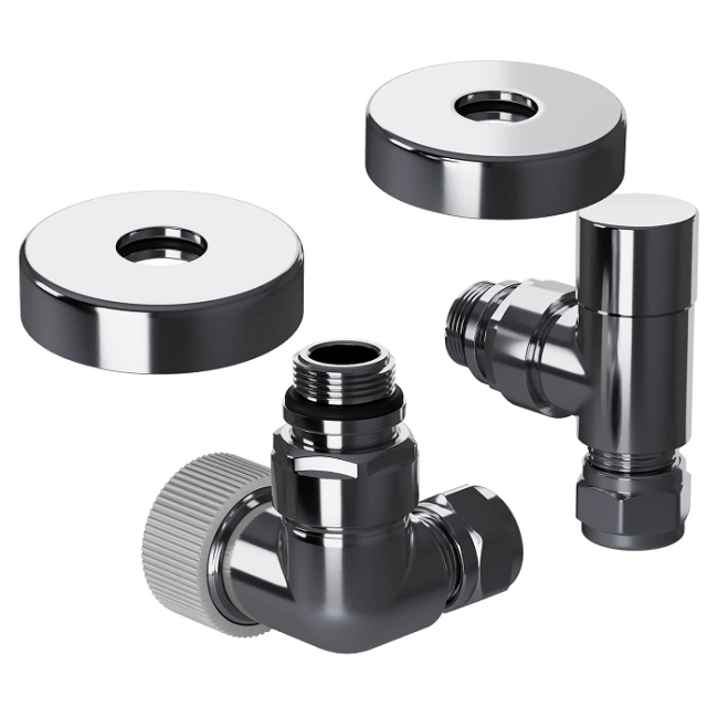 Термостатические наборы серии Design Pro поставляется в необходимой для чистового монтажа комплектации: клапан термостатический для установки на подающий трубопровод, запорный клапан для установки на обратный трубопровод, 2 гайки-фитинга для подключения клапанов к монтажной трубке 15 мм и 2 цельных латунных отражателя с внутренним резиновым уплотнением внутренним диаметром 15,2 мм.